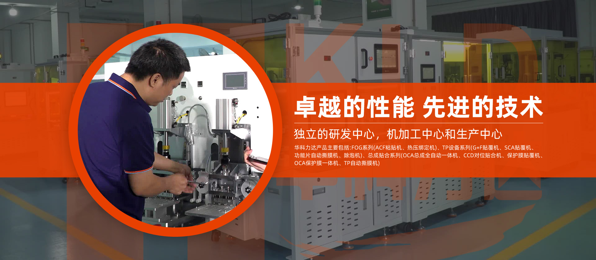 深圳華科力達(dá)自動(dòng)化設(shè)備有限公司成立于2013年,是一家集觸摸屏生產(chǎn)設(shè)備研發(fā)、制造、銷(xiāo)售及服務(wù)于一體的高新技術(shù)企業(yè)。華科力達(dá)的產(chǎn)品主要包括:FOG系列(ACF粘貼機(jī)、熱壓綁定機(jī))、TP設(shè)備系列(G+F貼覆機(jī)、SCA貼覆機(jī)、功能片自動(dòng)撕膜機(jī)、除泡機(jī))、總成貼合系列(OCA總成全自動(dòng)一體機(jī)、CCD對(duì)位貼合機(jī)、保護(hù)膜貼覆機(jī)、OCA保護(hù)膜一體機(jī)、TP自動(dòng)撕膜機(jī)),且廣泛應(yīng)用于:智能穿戴、手機(jī)、平板、車(chē)載和家電等所有帶觸控功能的電子設(shè)備領(lǐng)域。